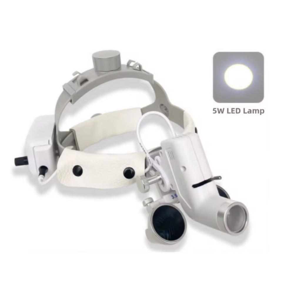 Потужна LED-підсвітка (5W): Світлодіод генерує інтенсивний потік чистого білого світла (яскравість до 65 000 люкс). Важливо, що світловий промінь спрямований паралельно лінії погляду, що повністю усуває проблему тіней у глибоких порожнинах.